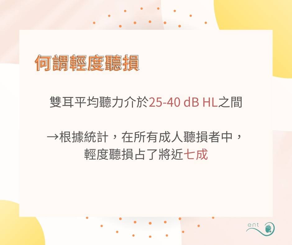 當聽力閾值在25分貝以上即視為有聽力損失,其中,輕度聽損為介於25-40分貝之間,占全體成年聽損者中的7成,而民眾對於輕度聽損的警覺性並不高。