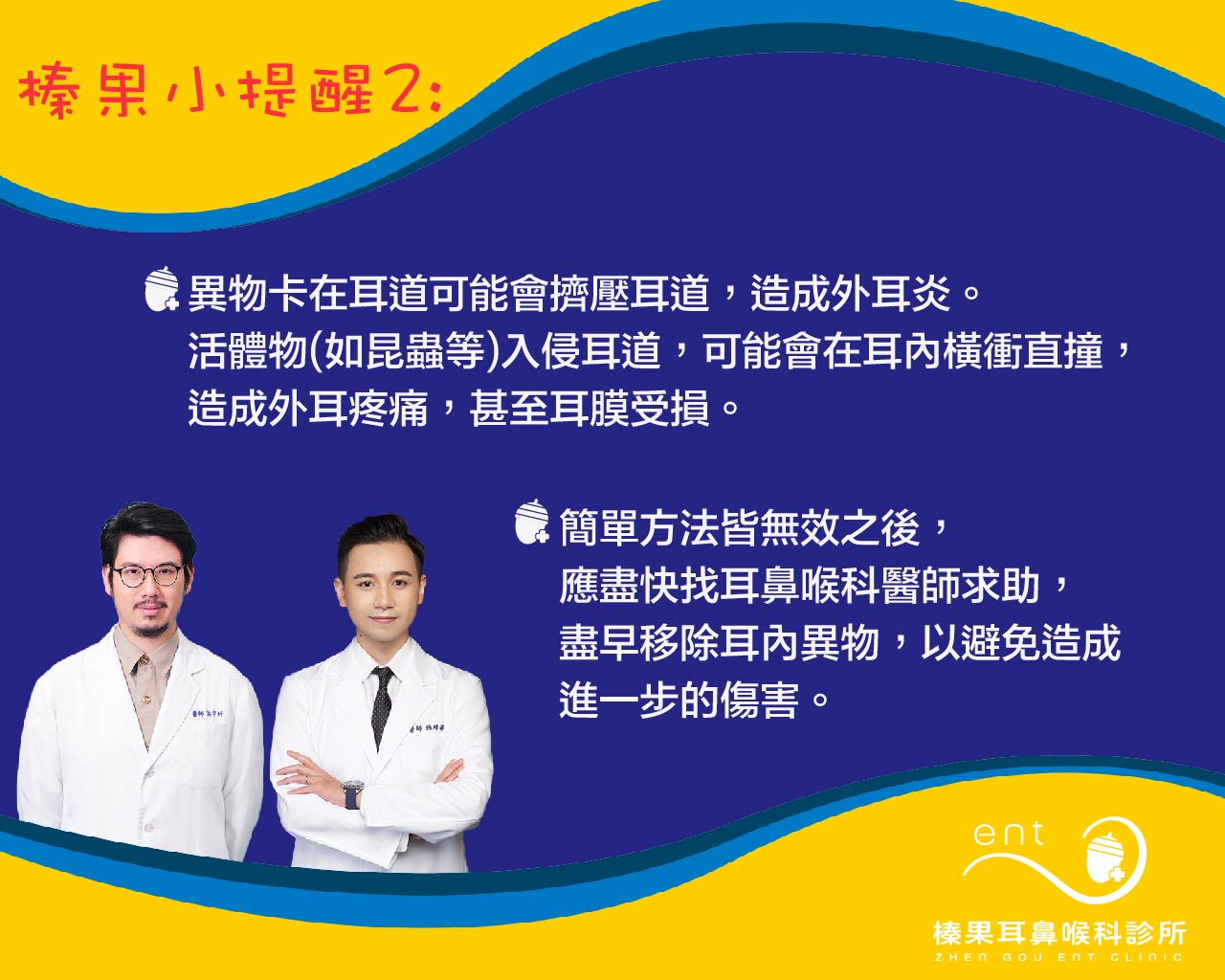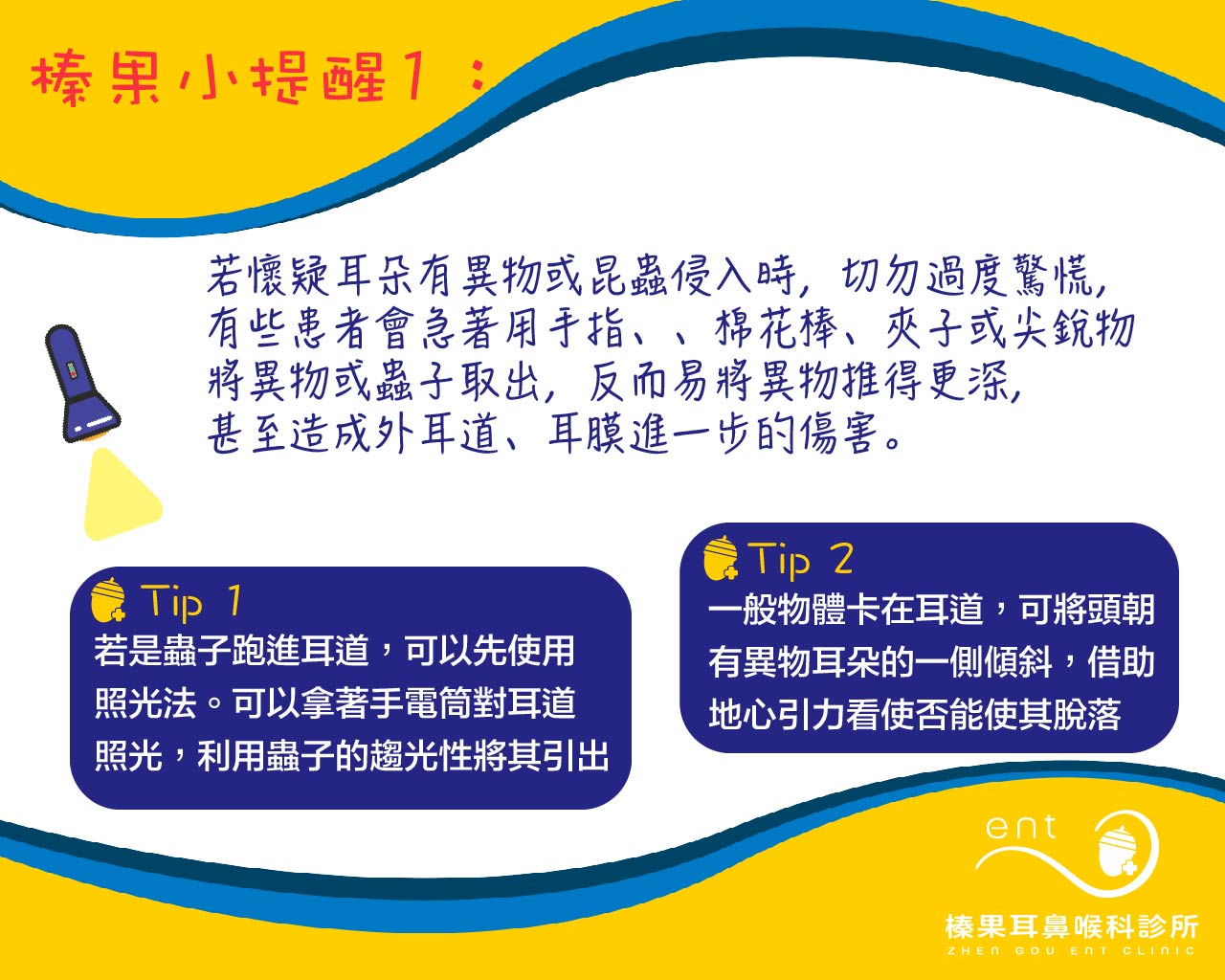 若懷疑耳朵有異物或昆蟲侵入時,切勿過度驚慌,有些患者會急著用手指、、棉花棒、夾子或尖銳物將異物或蟲子取出,反而易將異物推得更深,甚至造成外耳道、耳膜進一步的傷害