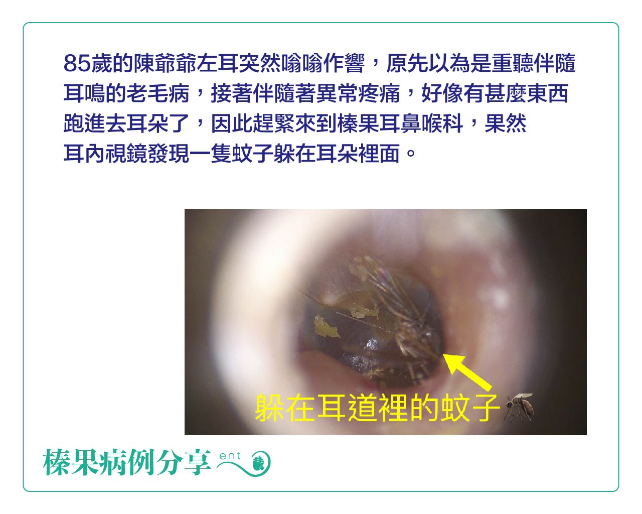 85歲的陳爺爺左耳突然嗡嗡作響,原先以為是重聽伴隨耳鳴的老毛病,接著伴隨著異常疼痛,好像有甚麼東西跑進去耳朵了,因此趕緊來到榛果耳鼻喉科,果然耳內視鏡發現一隻蚊子躲在耳朵裡面。