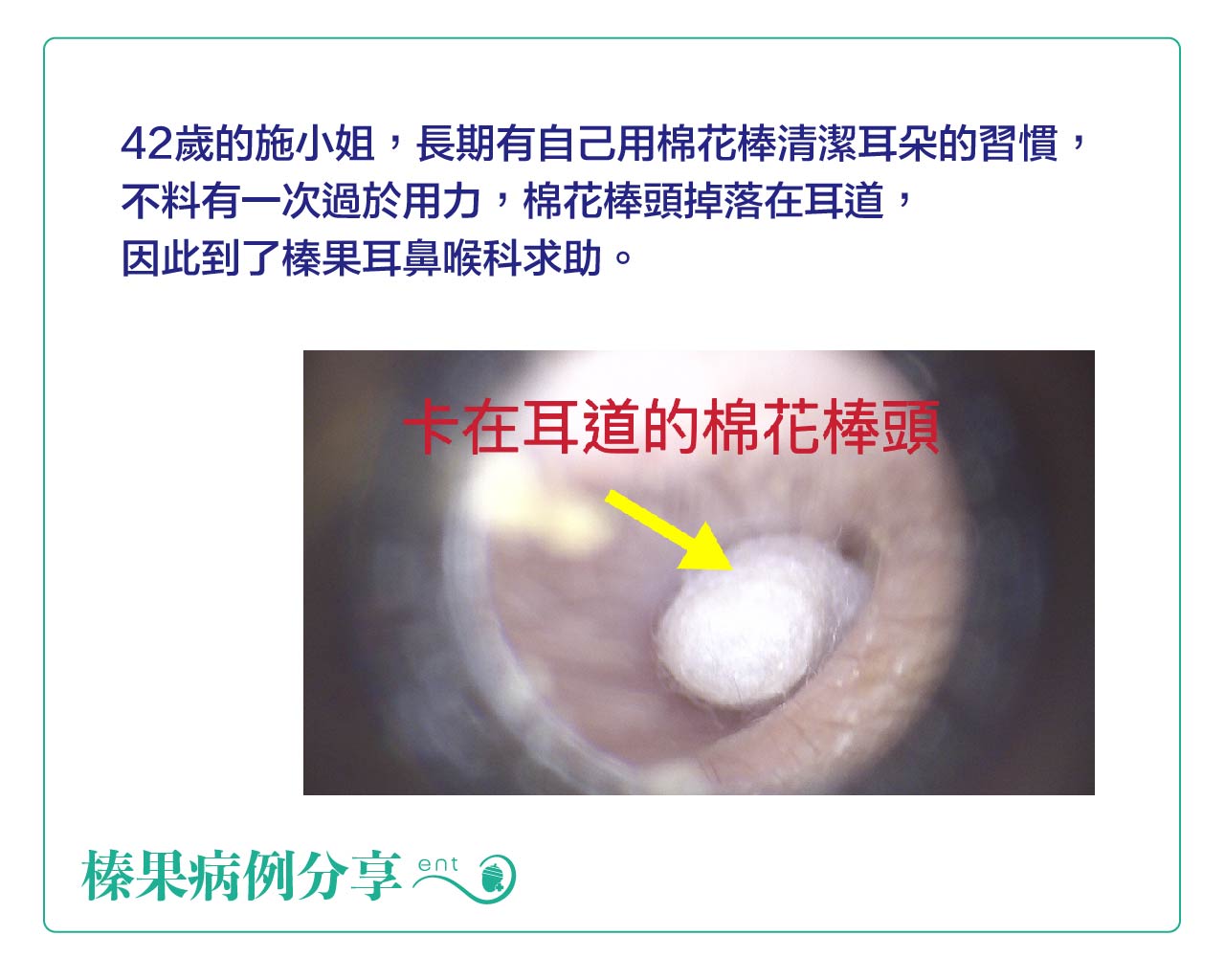 42歲的施小姐,長期有自己用棉花棒清潔耳朵的習慣,不料有一次過於用力,棉花棒頭掉落在耳道,因此到了榛果耳鼻喉科求助。