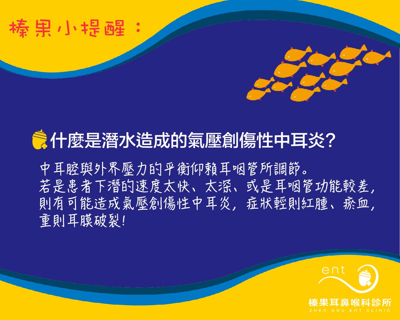 中耳腔與外界壓力的平衡仰賴耳咽管所調節。若是患者下潛的速度太快、太深、或是耳咽管功能較差,則有可能造成氣壓創傷性中耳炎,症狀輕則紅腫、瘀血,重則耳膜破裂!