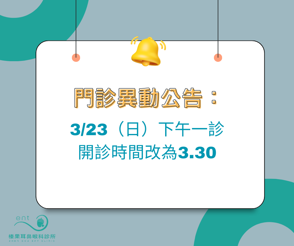 3/23 週日 門診時間異動 (台中耳鼻喉科)