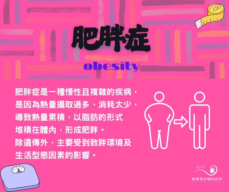 肥胖症是一種慢性且複雜的疾病,是因為熱量攝取過多、消耗太少,導致熱量累積,以脂肪的形式堆積在體內,形成肥胖。除遺傳外,主要受到致胖環境及生活型態因素的影響。