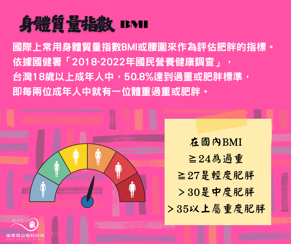 國際上常用身體質量指數(body mass index,BMI)或腰圍來作為評估肥胖的指標。在國內當BMI≧24為過重,≧27是輕度肥胖,>30是中度肥胖,>35以上就屬重度肥胖了。依據國健署「2018-2022年國民營養健康調查」,台灣18歲以上成年人中,50.8%達到過重或肥胖標準,即每兩位成年人中就有一位體重過重或肥胖。