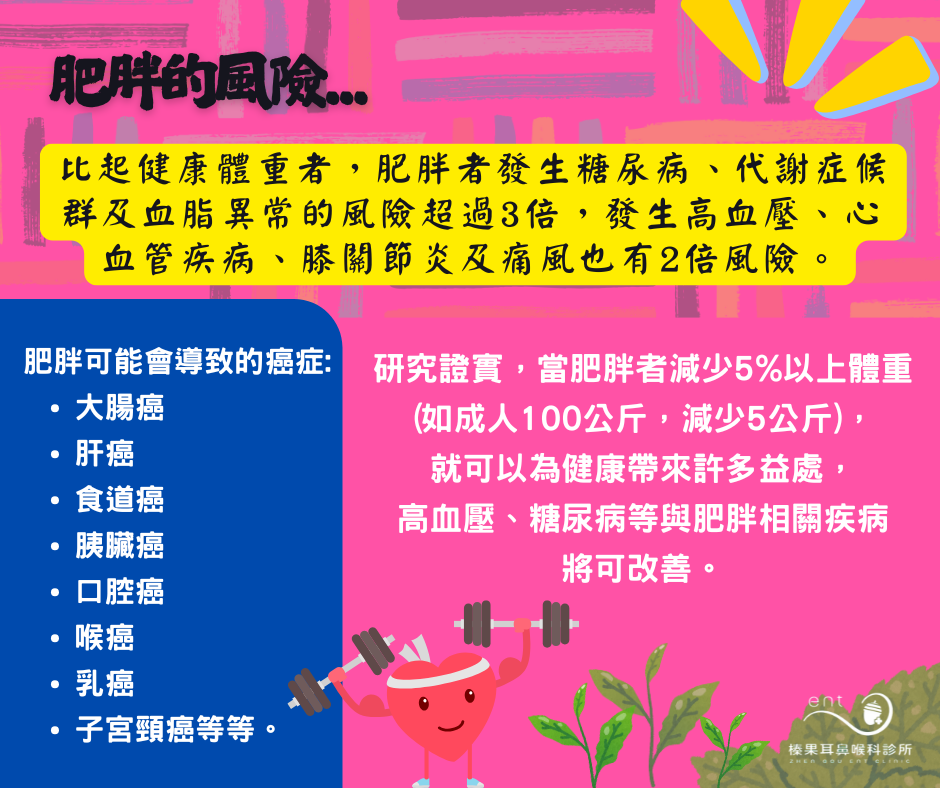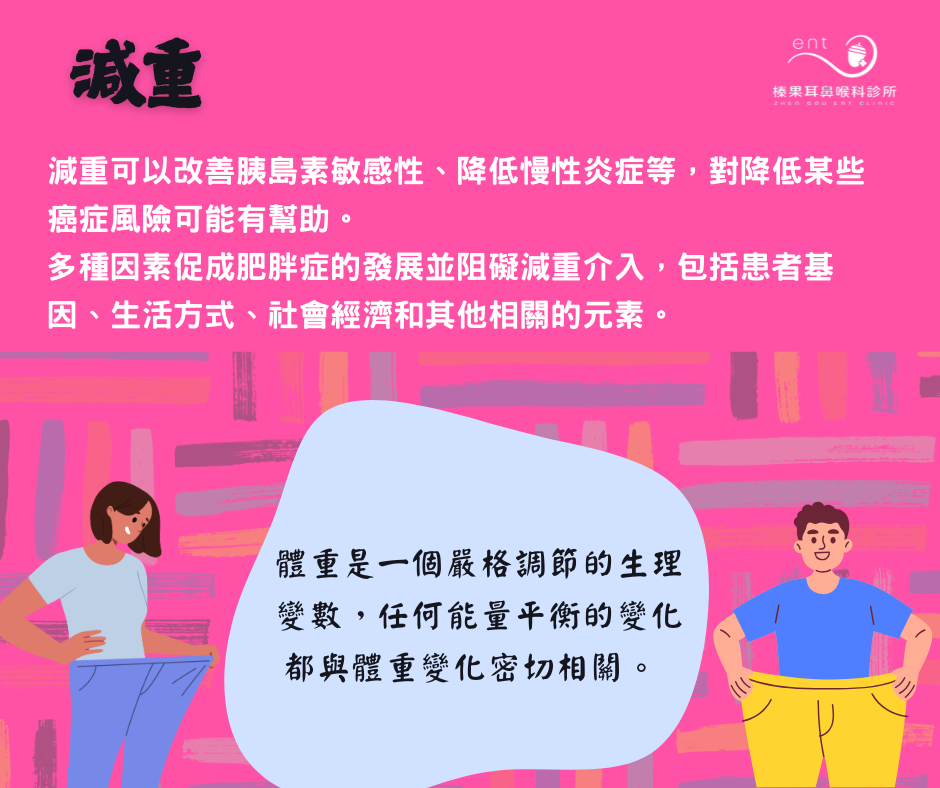 另外,肥胖可能會導致癌症包括大腸癌、肝癌、食道癌、胰臟癌、口腔癌、喉癌、乳癌、子宮頸癌等等。減重可以改善胰島素敏感性、降低慢性炎症等,對降低某些癌症風險可能有幫助。多種因素促成肥胖症的發展並阻礙減重介入,包括患者基因、生活方式、社會經濟和其他相關的元素。