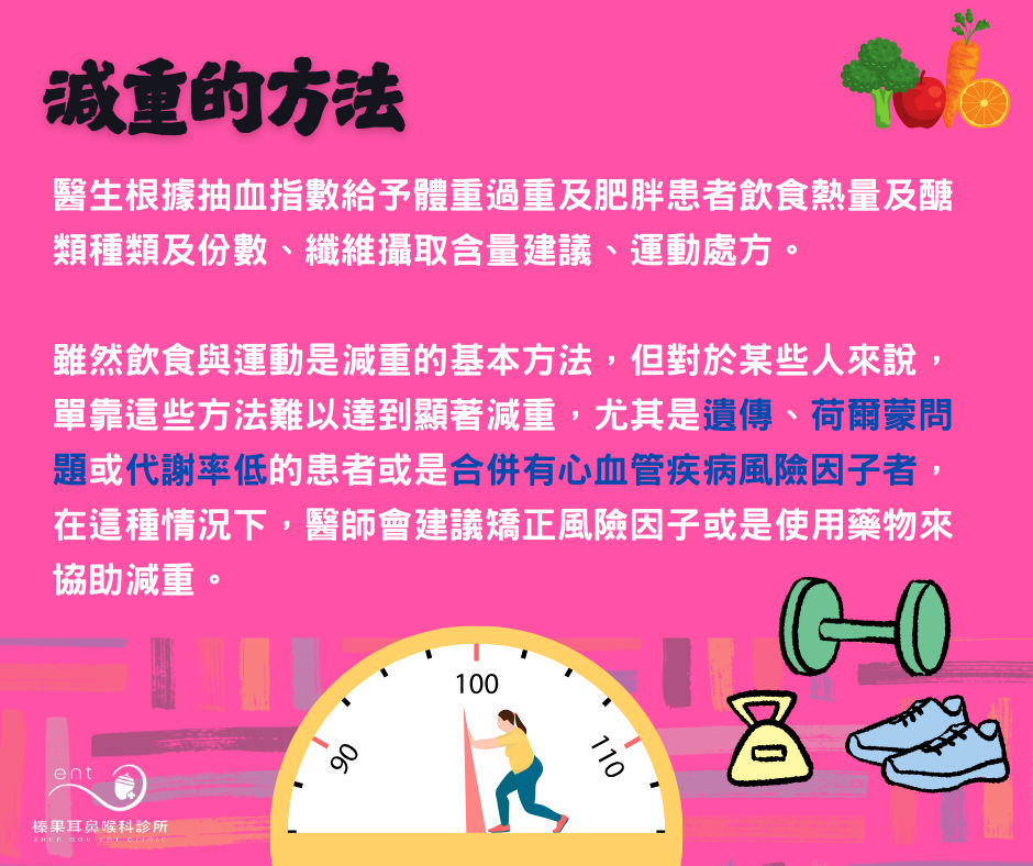 若能依據病理生理和能量平衡異常特性給予特別減重介入較能達到更好的結果。肥胖患者的生活型態控制,核心在於飲食調整、規律運動、行為改變與壓力管理。醫生根據抽血指數給予體重過重及肥胖患者飲食熱量及醣類種類及份數、纖維攝取含量建議、運動處方。雖然飲食與運動是減重的基本方法,但對於某些人來說,單靠這些方法難以達到顯著減重,尤其是 遺傳、荷爾蒙問題 或代謝率低的患者或是合併有心血管疾病風險因子者,在這種情況下,醫師會建議矯正風險因子或是使用藥物來協助減重。